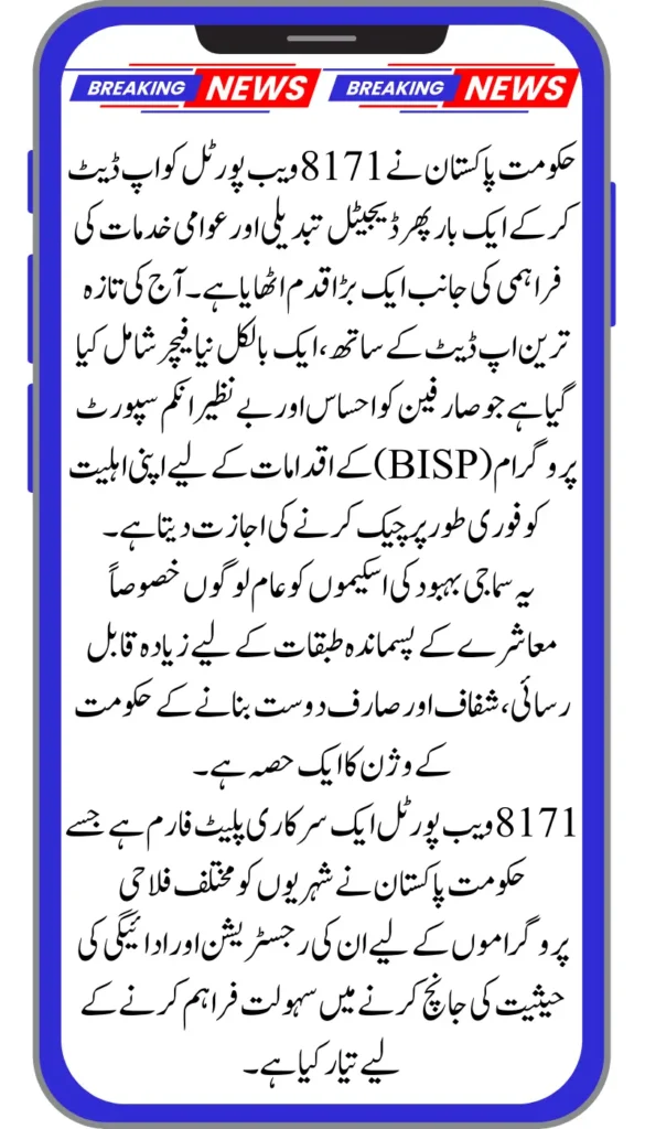 8171 web Portal: The Government of Pakistan has once again taken a major step towards digital transformation and public service delivery by updating the 8171 Web Portal. With the latest update rolled out today, a brand-new feature has been added that allows users to check their eligibility instantly for the Ehsaas and Benazir Income Support Program (BISP) initiatives.